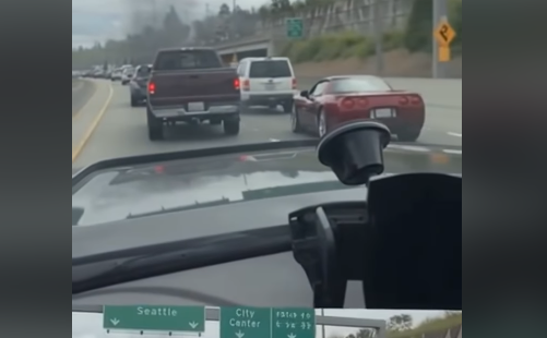 The incident reportedly occurred in Tacoma, Washington, on June 28. Both vehicles bore Washington State plates, and traffic conditions suggested a typical congestion point where patience is often tested. The driver who recorded the video later uploaded it to YouTube, explaining that he had been watching the Corvette repeatedly block the truck before the truck driver decided to respond in a way no one expected.